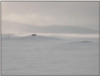 Nousin jo seiskalta kun ei enää tullut uni silmään. Auringonnousu oli hieno, mutta pääosin taivas oli pilvessä. Pakkasta aamulla aste pari. Lähdin laskeutumaan ja onneksi mäki ei ollut aivan niin jyrkkä kuin olin kuvitellut. Pääsin hyvin laskemaan alaspäin. Lämpötila vaihteli päivällä -2-+7 välillä ja samalla satoi myös 10 senttiä pehmeää nuoskaa... Taivaltaminen kävi lähes mahdottomaksi. Kun vaan tulisi niitä -5 päiviä niin jo auttaisi.
