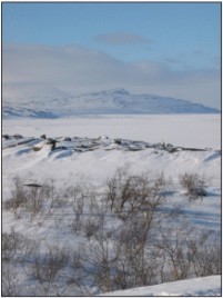 Vaihdoin sukset lumikenkiin mutta eipä se saatanointi siihen vielä loppunut. Ahkion pohjaan pakkasi lunta siihen malliin, että parhaimmillaan se oli kuin joku saatanan kyljelleen kaatunut norsu jolla on syöksyhampaan vetoaisoina. Kyllähän norsuakin hetken jaksaa vetää, mutta tämä peijooni vielä päätti itseään huvittaa sillä, että leikki Puuha-Peten yli-innokasta traktoria keräten toisen ahkiollisen lunta eteensä ihan vaan työntäkseen sitä paikasta toiseen. Sääli ettei sattunut enää sitä lappalaista pyssyn kanssa paikalle, että ois voinu ihan vaan rauhoittuakseen päästää pari laukausta ahkioon. Olisi siinä voinu mennä lapinmieskin sanattomaksi. Kyllä se nyt tässä tätä kirjoittaessa huvittaa, mutta veikkaampa, että huomenissa voi Staloluokta-city kuulla muutaman valitun suomalaisen sanan. Päästyäni pahan kohdan ohi ja saatuani taas ahkion luistamaan (kompassi on hyvä jääskraba) jatkoin lumikengillä Staloluoktan suuntaan. Kun ahkio liukui mukavasti ja löysin viimein kelkkauran (ensimmäinen viiteen päivään). Päätin loppumatkasta koittaa suksiakin. Hyvin pelasivat kelkkauralla ja loppumatka alkoi sujumaan. Tein pienen reittivalintavirheen aivan lopussa ja jouduin saapumaan jään kautta sightseen-reittiä Staloluoktaan. Yllätys oli suuri kun törmään takaa paljastui pieni kylä kartan muutaman kodan sijasta. Oikeita taloja siellä täällä reilusti yli kolmattakymmentä eivätkä kaikki olleet aivan pieniäkään.