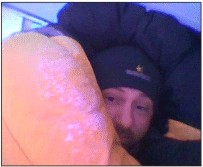 Helvetti että ahkio painaa. Edistyminen on hidasta ja taloudellisen vauhdin löytäminen on vaikeaa. Puoli kahdentoista aikoihin alkoi satamaan lunta rankasti eikä viisi senttiä uutta lunta yhtään auttanut matkantekoa. Edelleen automatkan rasitus painaa jaloissa. Yhdeltä söin lounaan. Ohitin matkalla parit mökit ja viimein päätin kolmelta laittaa teltan pystyyn. Kolme venyi puoli neljään ja juuri ennen teltan laittoa hiihdin pieneen sulaan. Ahkion liukuominaisuudet huononivat varmaan tuhannella prosentilla ja ärsytys oli suuri. Onneksi sain teltan suhteellisen helposti pystyyn ja laitoin heti ruoan tulemaan. Sulattelin vettä termospullot täyteen ja päätin ottaa pienet nokoset ennen ruokaa.