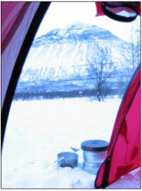 Huonosti nukutun yön jälkeen mietin tuulen suuntaa ja voimaa. Yöllä tuuli oli todella kova ja lämpötila nousi -2 asteeseen. Aamulla tuuli vielä 15 m/s ja meinasin passata päivän hiihdon kokonaan. Onneksi sain puhelimen välityksellä säätietoja ja illaksi tuulen oli luvattu heikkenevän. Alkumatka todella nihkeää, ensimmäinen tunti meni nostellessa ahkiota pystyyn ja etenin vain noin kilometrin tunnin aikana. Pari pientä nousua osui matkalle ja ne oli vedettävä ilman suksia. Muutoin päivä oli aika tasaista ja suhteellisen helppoa (maastoa). Aamun 15 m/s laantui 5-7 m/s:iin aika nopeasti mutta tuuli oli vastainen koko matkan. Majoittauduin vähän ennen neljää ja kaivoin oikein eteisen absidiin. Vielä iltaruoka ja sitten nukkumaan. Huomenna on tappopäivä, noin 400 korkeusmetriä kiivettävänä... Voi mennä siihen ylihuominenkin. Iltapuurot ei oikein maistu. Tulee syötyä toinen pussiruoka vasta kun on majoittuminen tapahtunut ja ruoan jälkeen alkaa uni maistumaan. Pesen tänään hampaat jos tahna suostuu tulemaan tuubista.